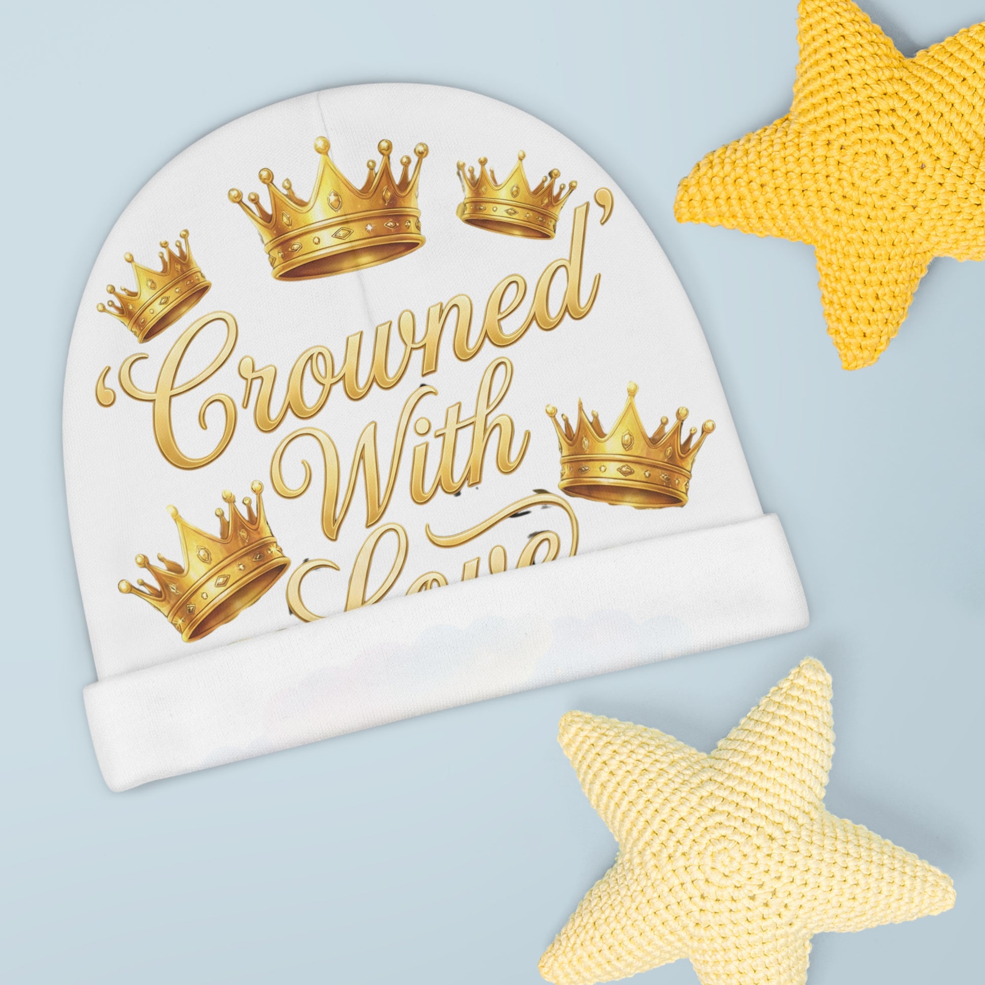 Baby Beanie — "Crowned With Love" Gold Crowns & Pastel Clouds Infant Hat