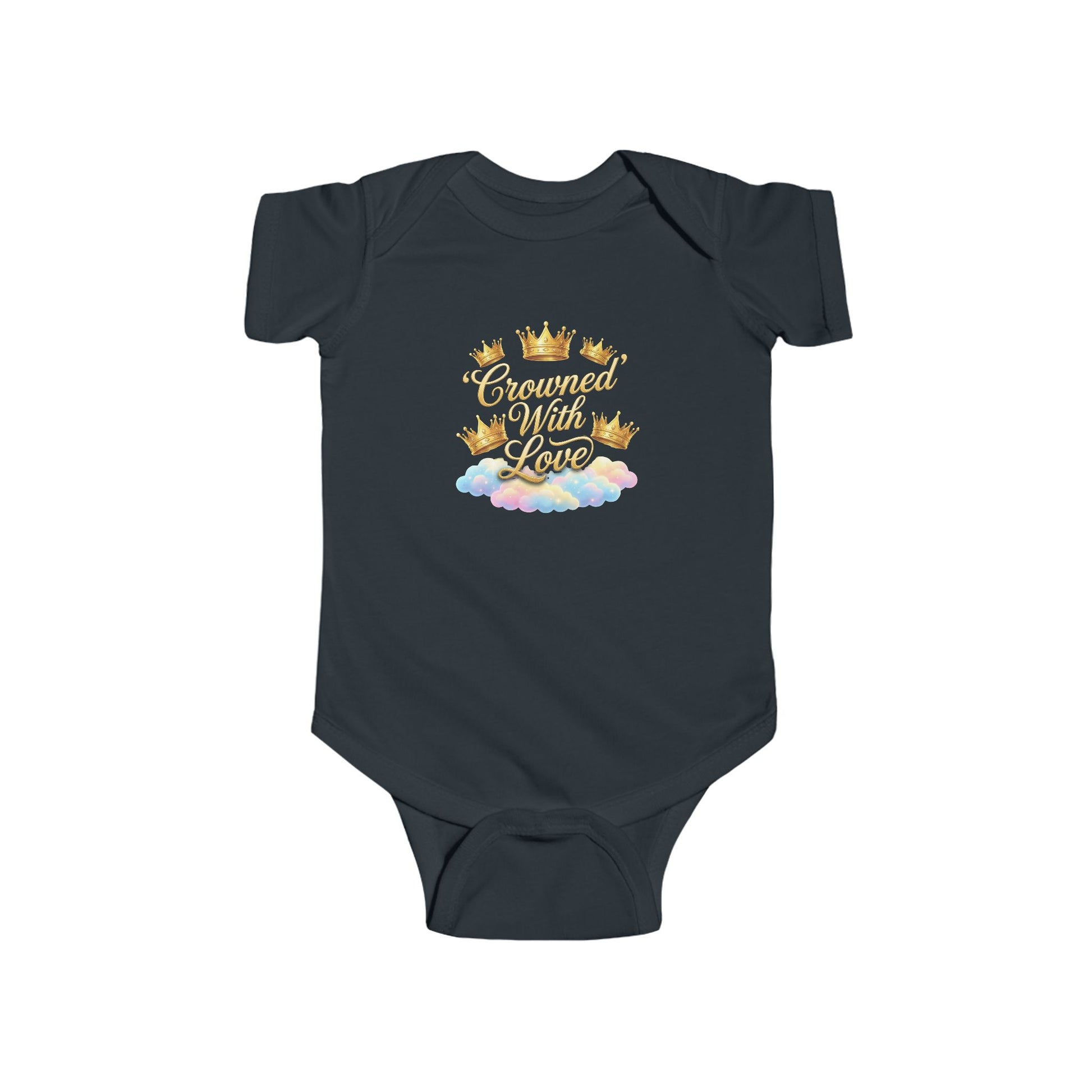 Soft, tiny royalty for little ones — this infant bodysuit wraps newborn days in gentle comfort and playful charm. The artwork nestles gold crowns and pearly script above a pastel cloud, giving a whimsical, cozy vibe that feels like lullabies and warm cuddles. Light, breathable fabric moves with baby, while the ribbed trim and side seams keep the shape through wash and wear. Snap closure at the bottom makes diaper changes quick and fuss-free, so more time is left for snuggles and sleepy smiles. A simple, sweet piece that wears like a quiet celebration of new life.